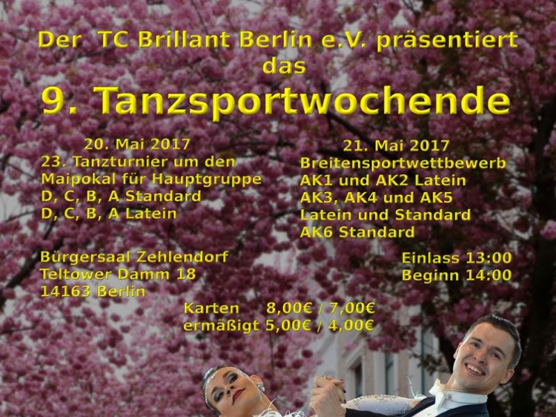 | Meldungen an | Tanzclub Brillant Berlin e.V. Malteserstr. 118-120, 12249 Berlin Tel: 030 76703070 / Fax: 030 76703072 E-Mail: info@tc-brillant.de |