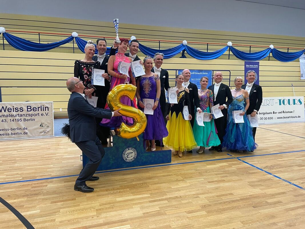 Schon am Samstag standen Jan Geidel / Andrea Biegler-König (TC Blau Gold im VfL Tegel 1891) im größten Starterfeld des Wochenendes (Masters III A, 15 Paare) als Dritte auf dem Siegertreppchen, konnten sich dann aber am Sonntag nochmals steigern und gewannen alle Tänze und damit souverän das Turnier der Masters III A. In der letzten Siegerehrung des Turnierwochenendes erhielten sie dann nicht nur den Siegerpokal, sondern auch die frohe Nachricht, dass sie nun in die S-Klasse aufgestiegen sind.