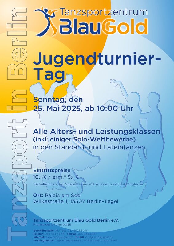 Am 25.05.2025 findet im Tanzsportzentrum Blau Gold Berlin e.V. der nächste Jugendturniertag statt. Es erwarten euch Turniere für alle Alters- und Leistungsgruppen im Nachwuchsbereich sowie auch einige Solo-Turniere.