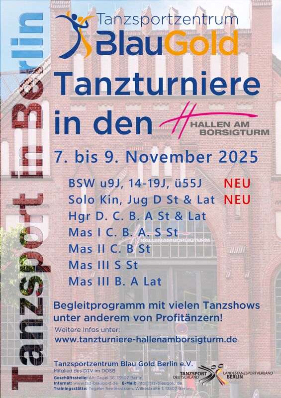 Bei den Tanzturnieren in den Hallen am Borsigturm, veranstaltet vom TSZ Blau-Gold, kommt es am 08. November 2025 zu einer historischen Neuerung. Im August 2025 erneuerten der Deutsche Tanzsportverband (DTV) und der Allgemeine Deutsche Tanzlehrerverband (ADTV) ihr Abkommen. Teil dieser Vereinbarung ist die Möglichkeit zur Öffnung von ADTV Tanzschulturnieren und DTV Breitensportwettbewerben für Sportler*innen des jeweils anderen Verbands.