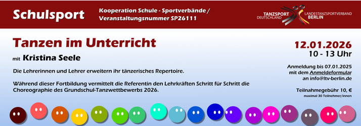 Die anerkannte Fortbildungsveranstaltung (Veranstaltungsnummer SP25183) und findet am 12. Februar 2025 (Mittwoch) von 10 bis 13 Uhr im Landesstützpunkt Tanzen (ehemals Landesleistungszentrum) statt. Anmeldungen sind bis zum 07. Februar 2025 mit dem Anmeldeformular per E-Mail an info@ltv-berlin.de möglich - maximal 30 Teilnehmer/innen. Es wird eine Teilnahmegebühr von 10, €/Person erhoben.