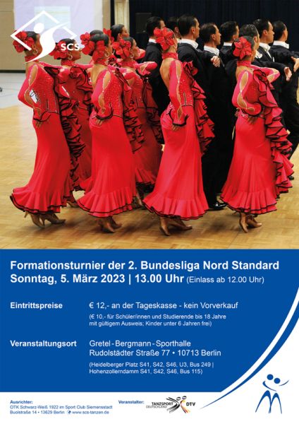 Am Sonntag den 3.5.2023 findet in der Gretel Bergmann Sporthalle (Rudolstädter Str. 77, 10713 Berlin) das dritte Turnier der 2. Bundesliga Nord der Standardformationen statt.