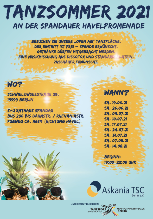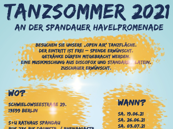 Seit mehreren Jahren veranstaltet der Askania TSC seinen Tanzsommer an der Spandauer Havelpromenade. Ein kleiner Geheimtip nicht nur unter den Spandauer Tanzfreunden. Hier kann man samstags von 19 - 22 Uhr, mit und unter Freunden Tanzen und die hoffentlich lauen Sommernächte genießen. Auch noch die beiden nächsten Samstage.