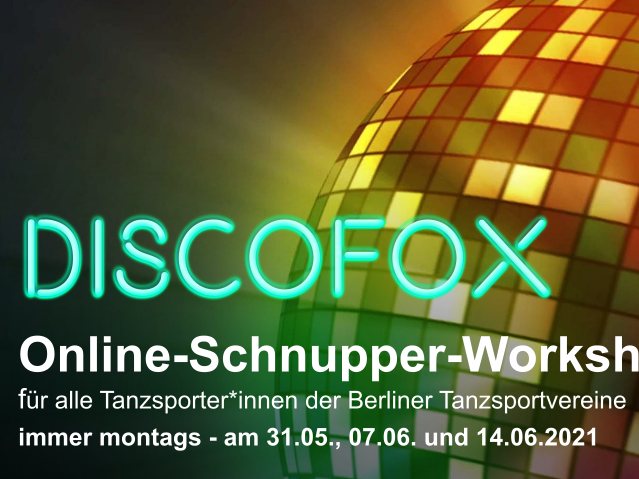 Als ein Teil der Fortetzung von kostenlosen und öffentlichen Angebote für die Mitglieder der Berliner Tanzsportvereine wird ab Ende Mai jeder Montag zum "Discofox-Montag". Drei Online-Schnupper-Workshops gestaltet Michael Putzolu und es sind wirklich alle - von jung bis jünger, Freizeit- und Leistungssportler*innen, herzlich eingeladen.