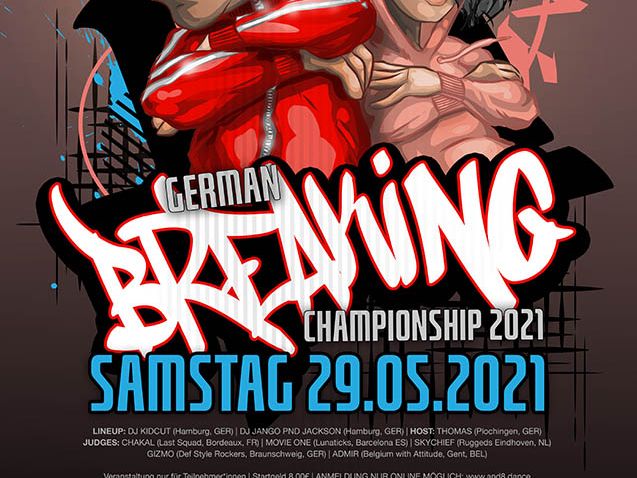 Der Deutsche Tanzsportverband veranstaltet in Kooperation mit der Stadt Hannover die "German Breaking Championship 2021". Am 29. Mai werden im Freizeitheim Döhren (Hannover) die besten Tänzer*innen gesucht, die Deutschland bei der Europameisterschaft in Sotschi (Russland) und bei der Weltmeisterschaft in Nanjing (China) vertreten. Getanzt wird im "1vs1 Battle"-Format sowohl bei den B-Boys und B-Girls. Aufgrund der aktuellen Rahmenbedingungen allerdings ohne Zuschauer.
