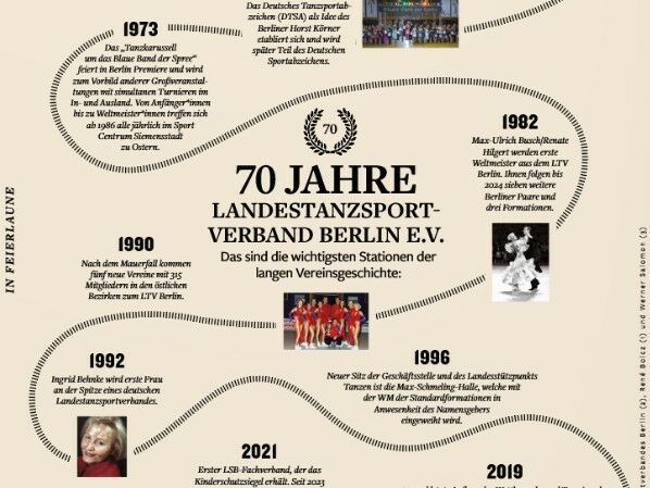 Das Printmagazin des Landessportbund Berlin "Sport in Berlin" gratuliert in seiner aktuellen Ausgabe (1/2025) zum 70jährigen Bestehen des Landestanzsportverband Berlin. Für die Rubrik "In Feierlaune" (Seite 38 ) hat LTV-Archivar Dirk Ullmann einige Stationen unserer Verbandsgeschichte zusammengestellt. Bekannte und weniger bekannte Meilensteine führen von den Anfängen im Jahr 1955 bis in die Gegenwart.