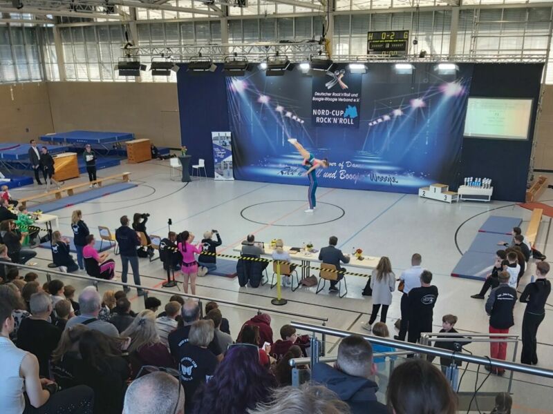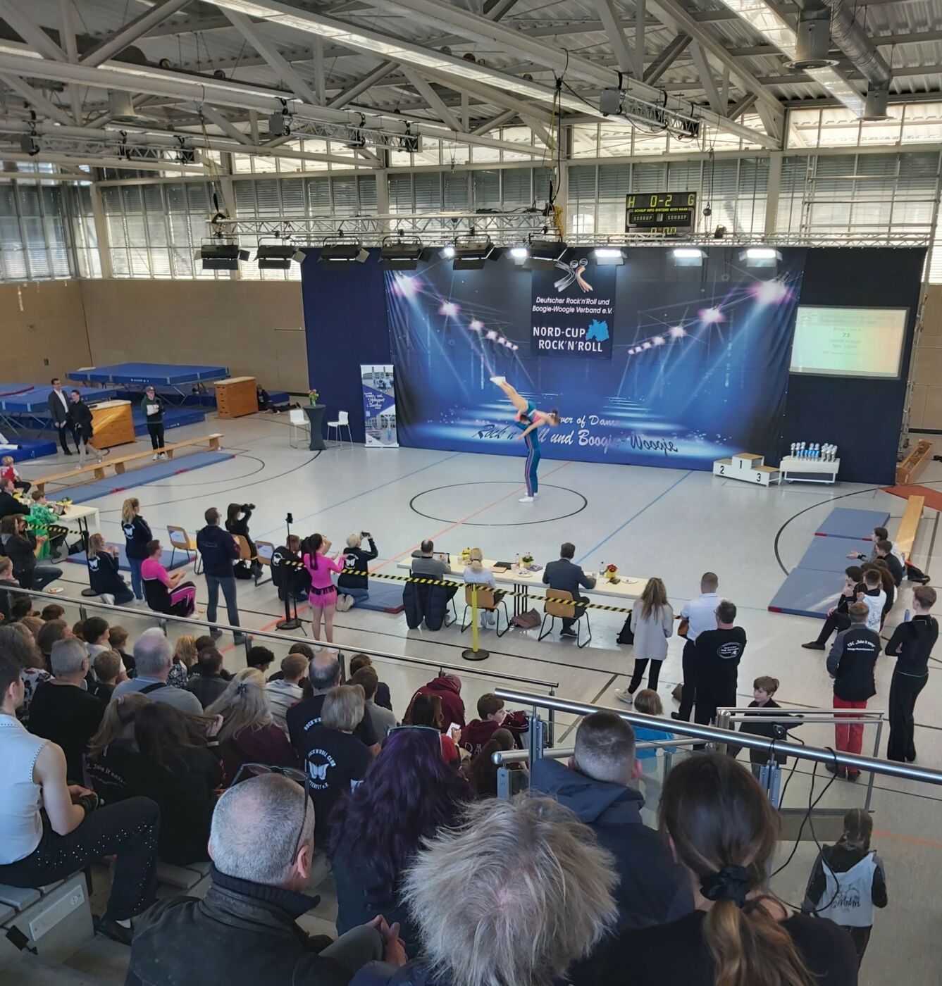 Vor 250 Zuschauern in der Wilmersdorfer Gretel-Bergmann-Sporthalle wurden am Samstag (22. März) die Turniere der Nord-Cup-Serie von den Schülern bis zur A- Klasse ausgetragen. 25 Helfer sorgten für einen reibungslosen Ablauf der Turniere, die in den Nachwuchsklassen auch Bodenturnen und Trampolinspringen umfassten - und daher Mehrkampf heißen. Ab der B-Klasse gab es dann individuelle Auftritte der Top-Paare in jeweils einer Fußtechnik- und einer Akrobatik-Runde zu sehen, somit wurde es am Ende des Nachmittags noch richtig dynamisch. Und die rund 50 Paare aller Klassen wurden von den gut gefüllten Zuschauerrängen angefeuert und unterstützt.