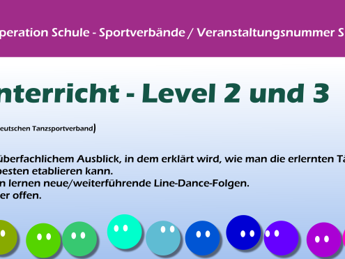 Dieser Kurs ist auch für Neu-Einsteiger geeignet. Im großen und gut belüfteten Klaus-Koch-Saal des LLZ Tanzen ergibt sich somit für Lehrkräfte an Schulen die gute Gelegenheit, bei einer Präsenz-Fortbildung weitere Impuls für die schulische Arbeit zu erhalten. Die Teilnehmer*innen lernen neue/weiterführende Line-Dance-Folgen.
