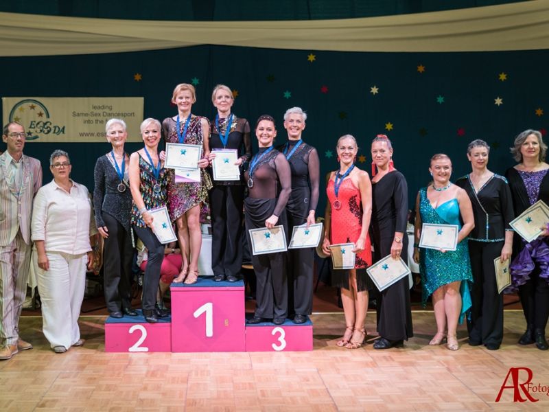 Für die Berliner_innen sprangen auch wieder einige tolle Platzierungen und Titel heraus. In der 40+ Frauen A tanzten Almut Freund/Dorothea Arning (TC Spree Athen) in Latein und in der Kombination zum Europameistertitel. Aus der Babypause zurück tanzten Kerstin Kallmann/Cornelia Wagner (pinkballroom der TiB 1848) in der Kombination der Frauen 18+ zum Vizemeistertitel. Zwei Silbermedaillen (Latein und Kombination) nahmen bei den Männern 40+ Thomas Emanuel Bensch/Rene Gumhold (tsc richtigrum Berlin/TSC Balance) entgegen. Im Feld der Frauen 18+ Latein erreichten Ulrike Hesselbarth/Kristin Marunke (pinkballroom der TiB 1848) den Bronzerang.