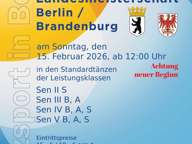 Sonntag, 15. Februar Landesmeisterschaften Standard - Senioren II S, Senioren III BA, Senioren IV BAS und Senioren V BAS - Ort: TSZ Blau Gold Berlin, Palais am See, Wilkestr.1, 13507 Berlin >Meldeschluss: Donnerstag 5. Februar, 23:59 Uhr