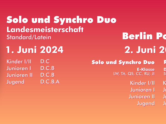 Nachdem das Pilotprojekt "Solo und Synchro Duo" seit Anfang des Jahres in den Regelsportbetrieb integriert wurde, findet am 1.Juni im Landesleistungszentrum Tanzen erstmals eine Berliner Solo und Synchro Duo-Landesmeisterschaft Standard und Latein statt.