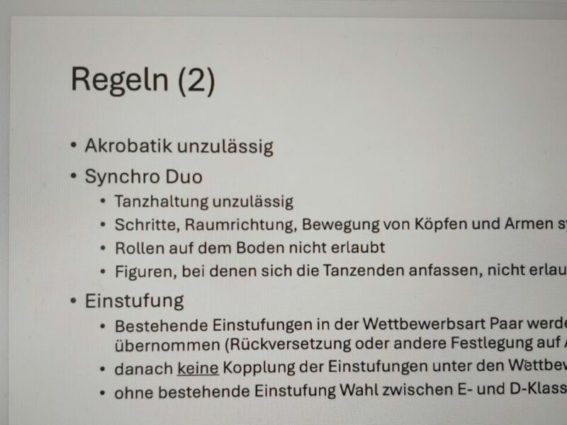 Das erfolgreiche Pilotprojekt "Solo und Synchro Duo" wurde im deutschen Tanzsportverband mittlerweile in den Regelsportbetrieb (TSO, Abschnitt F, Teil III - ab Seite 41) integriert. Seit Januar sind diese neuen Wettbewerbsarten auch über die ESV und gängigen Turniersoftwares durchführbar.