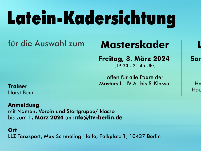 Ab sofort ist das Online-Meldeportal zu den 13 WDSF-/DTV-(Welt-)Ranglistenturnieren beim Berlin Dance Festival 2024 geöffnet. Auch Meldungen zu den 20 offenen, nationalen Nachwuchsturnieren sind ab sofort möglich - wer hier früh und zwar bis spätestens 25. März meldet - kann vergünstige Eintrittskarten für Begleitpersonen erwerben. Mehr Infos dazu in Kürze.