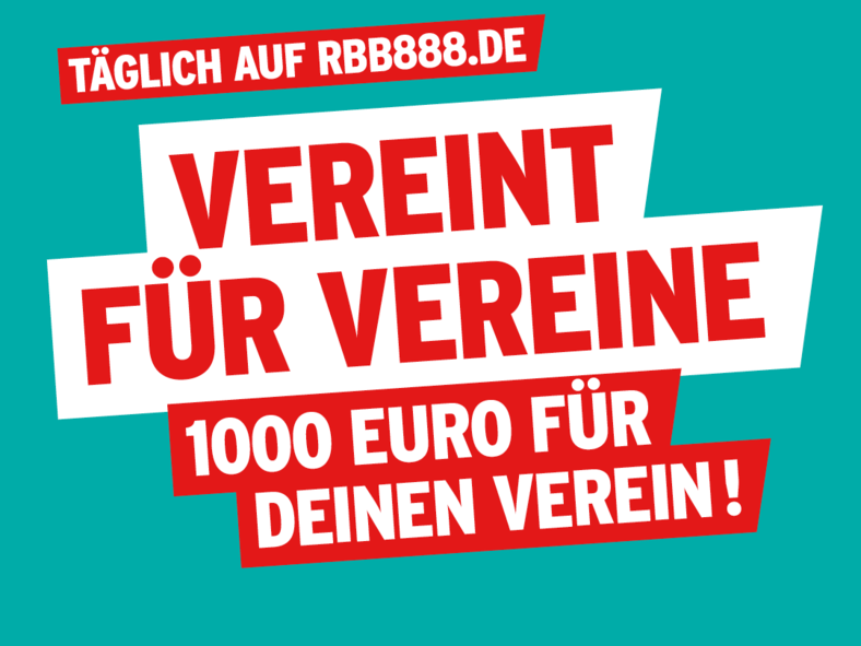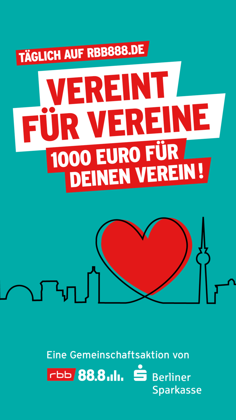 Vereine bewegen Berlin. Sie schaffen Gemeinschaft und Zusammenhalt, Integration und wertvolle Erlebnisse. Das Problem: An Ideen und Engagement mangelt es den Mitgliedern selten, an Ausstattung und Geld hingegen oft. Deshalb unterstützt "rbb 88.8" - die Berliner Landeswelle des rbb – nun gemeinsam mit der Berliner Sparkasse Vereine in der Hauptstadt mit je 1000 Euro! Vom 19. Februar bis zum 16. März 2024 erhalten gemeinnützige Vereine in Berlin die tägliche Chance auf einen Scheck im Wert von je 1.000 Euro.