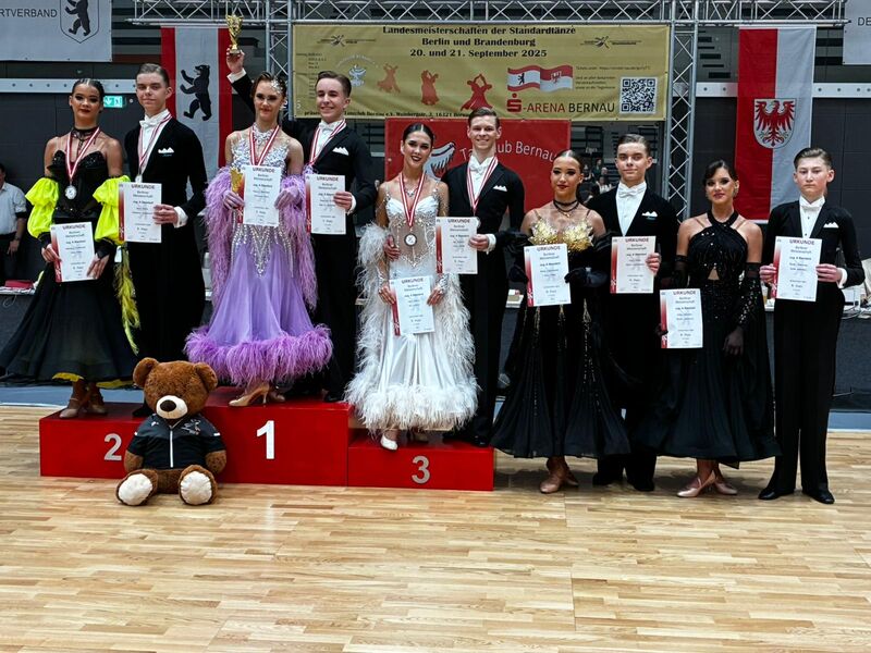Am vergangenen Sonntag (21. September) kamen die besten Berliner Nachwuchspaare nach Bernau, um die Berliner Meister 2025 im Standardbereich zu küren. In der modernen Veranstaltungsstätte füllten die Paare mit herausragenden Leistungen die Arena mit Stimmung. Das Maskottchen der Berliner Tanzsportjugend (BTSJ), Berli, war ebenfalls den ganzen Tag über fleißig dabei, die Tänzerinnen und Tänzer zu unterstützen und anzufeuern.