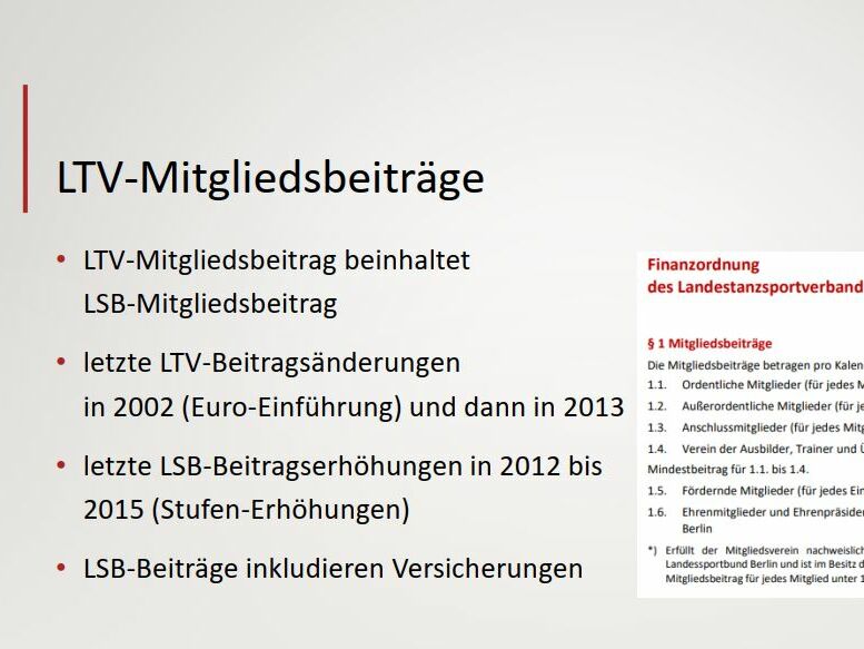 Seit mehr als einem Jahrzehnt sind die LTV-Mitgliedsbeiträge konstant - zur EURO-Einführung 2002 und dann 2013 wurden letztmalig die Beiträge angepasst. Nun hatte im vergangenen Jahr die LSB-Mitgliderversammlung eine stufenweise Erhöhung des Beitrags pro Einzelmitglied beschlossen. Die daraus für den LTV Berlin resultierende Erhöhung zum Jahr 2023 wurde aus dem laufenden Haushalt bestritten. Doch insgesamt wird der Jahresbeitrag pro Mitglied eines Berliner Sportvereins bis in fünf Jahren um jährlich 1,26 Euro (im Vergleich zu 2022) steigen. Hinzu kommen die allgemeinen Kostensteigerungen, die natürlich auch alle LTV-Bereiche betreffen.