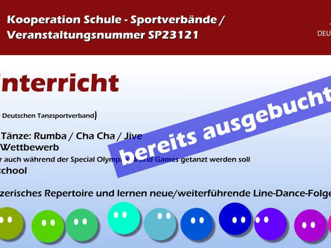 Bundes- und Landestrainer Latein Horst Beer stellt den Schul-Lehrkräften im Landesleistungszentrum Tanzen in der Max-Schmeling-Halle (Falkplatz 1, 10437 Berlin) von 11 bis 15 Uhr Choreografie-Vorschläge für den Schulunterricht vor. So werden u.a. Choreografien für Solo / Duo (z.B. Rumba / Cha Cha / Jive) gezeigt.