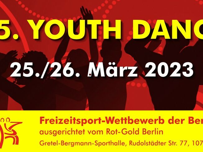 Der 15. Youth Dance Contest nähert sich mit großen Schritten! Also am besten gleich jetzt anmelden zur Veranstaltung am 25. und 26. März in der Gretel-Bergmann-Sporthalle. Und zwar unter https://rotgold-berlin.de/veranstaltungen...dort könnt ihr euch noch bis zum 15. März anmelden und findet ihr auch die Teilnahmebedingungen und Regeln.