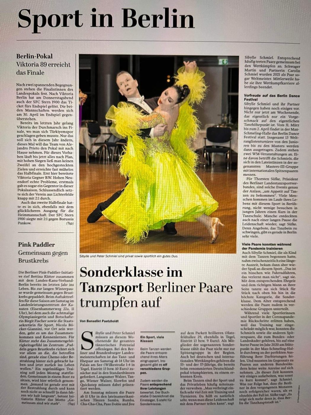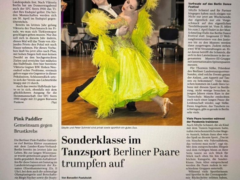 Der TAGESSPIEGEL berichtet am Samstag (4. März) in seiner Print- und Digital-Ausgabe über den Berliner Tanzsport. Pünktlich zu den Berliner und Brandenburger Landesmeisterschaften an diesem Wochenende und mit Ausblick auf das Berlin Dance Festival Ende des Monats in der Max-Schmeling-Halle.