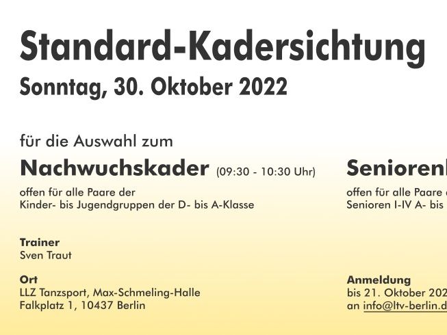 Nachdem der ursprünglich für Mitte Oktober geplante Termin für die Kadersichtungen Standard aus Termingründen nicht mehr möglich war, haben BTSJ-Jugendausschuss, das LTV-Präsidium und Landestrainer Standard, Sven Traut, einen neuen Termin vereinbart: Sonntag, 30. Oktober 2022