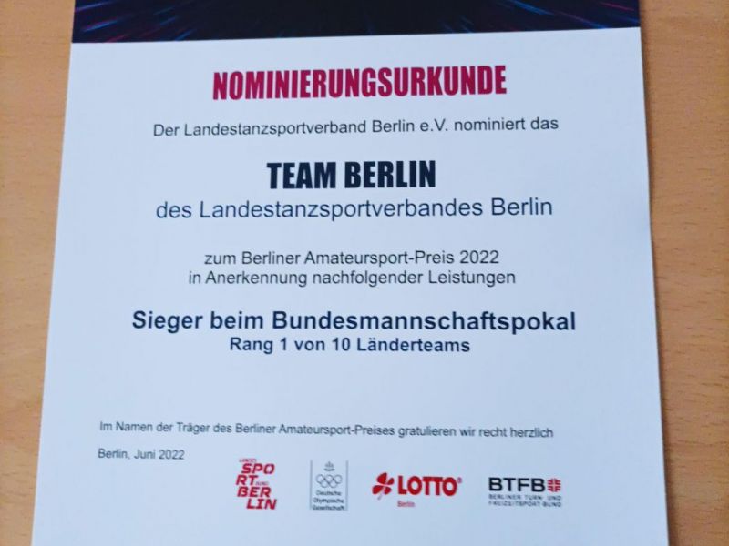 Am Freitag abend wurde in der VIP-Lounge der Max-Schmeling-Halle der diesjährige Berliner Amateur-Sportpreis verliehen. In Anwesenheit der Paare Fabian Lohauß/Simone Braunschweig, Peter und Sybille Schmiel sowie LTV-Vize-Präsident Götz Moser wurde das erfolgreiche LTV-Team des Bundesmannschaftspokal 2021 geehrt.