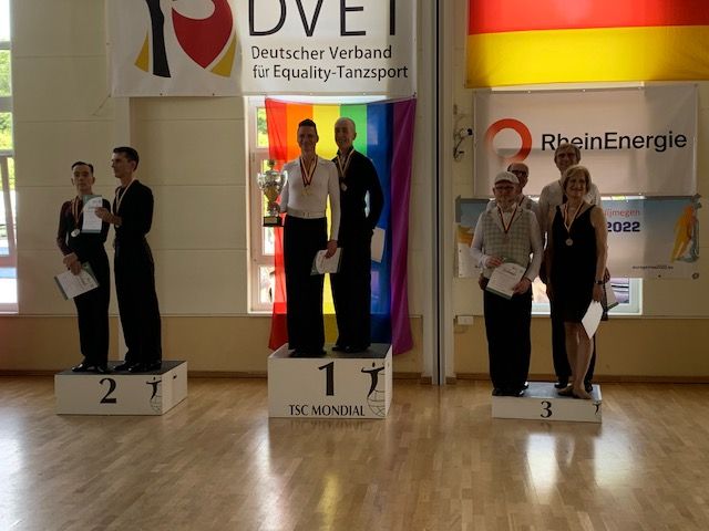 Bei den 17. offenen internationalen Deutschen Meisterschaften in den Standard- und Lateintänzen für Frauen- und -Männerpaare, die an diesem Wochenende in Köln ausgetragen wurden, waren die Berliner Vertreter*innen in zahlreichen Klassen und Turnieren erfolgreich. Den Titel "Deutsche Meister" tragen im Equality-Tanzsport nur die Sieger der A-Klasse (= höchste Klasse) und in diese Meisterliste haben sich nun Thomas Bensch und Simone Biagini (btc Grün-Gold) eingetragen, die Deutsche Meister der Männer 40+ Latein und Vizemeister der Männer 40+ Standard wurden. Damit wurden sie zum dritten Mal Deutsche Meister in der Kombinationswertung der Senioren (Foto Siegerehrung) und dürfen den Wanderpokal der Senioren-Kombination nun behalten. Und in der jüngeren Hauptgruppe wurden die beiden zudem noch Vize-Meister in der Kombination.