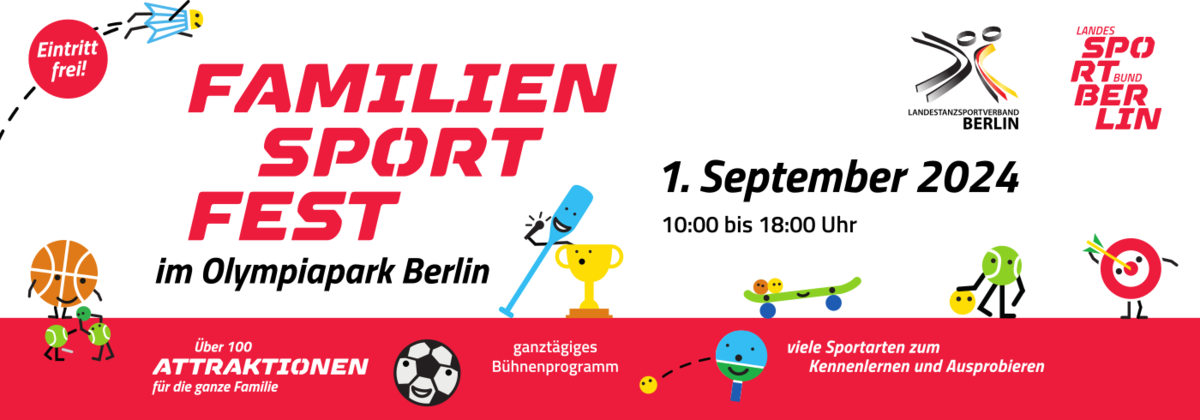 Am letzten Sonntag der Berliner Sommerferien - am 1. September - findet wieder das Familiensportfest im Olympiapark Berlin statt. Beim größten Berliner Spiel- und Sportfest stellen sich über 50 Organisationen - darunter viele Berliner Sportverbände und -vereine - mit ihren Angeboten vor. Rund 150 Mitmachaktionen aus den Bereichen Sport und Gesundheit bieten den Besucher*innen die Möglichkeit viele verschiedene Sportarten kostenlos auszuprobieren - und auch Tanzen. Mit der Gesundheitsmeile, dem Deutschen Sportabzeichen und dem ganztägigen Showprogramm mit viel Tanz(sport) und Musik auf einer Bühne gibt es viele Highlights für Groß und Klein. Der Eintritt ist frei.