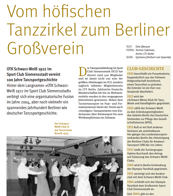 Blättern Sie in der Chronik des zweitältesten, aber doch jung gebliebenen Tanzsportclubs Deutschlands, der viele Höhen und Tiefen erlebte und nun seit einigen Jahren als OTK SchwarzWeiß 1922 im Sport Club Siemensstadt firmiert. Wir blicken auf schwierige Zulassungsverfahren unmittelbar nach beiden Weltkriegen (1920-22 und 1947-49), zwei Fusionen (1976 und 2004), etliche Heimstätten in Hotels, Restaurants, Tanzschulen und Sporthallen sowie herausragende Persönlichkeiten auf und neben dem Parkett, unzählige sportliche Erfolge und gesellschaftliche Anerkennungen zurück.