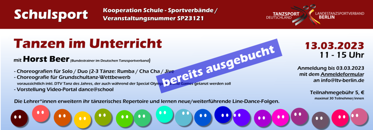Bundes- und Landestrainer Latein Horst Beer stellt den Schul-Lehrkräften im Landesleistungszentrum Tanzen in der Max-Schmeling-Halle (Falkplatz 1, 10437 Berlin) von 11 bis 15 Uhr Choreografie-Vorschläge für den Schulunterricht vor. So werden u.a. Choreografien für Solo / Duo (z.B. Rumba / Cha Cha / Jive) gezeigt.