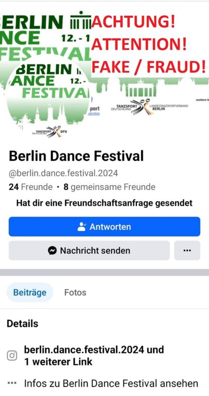 Wir warnen vor einer betrügerischen Facebook-Seite, die vortäuscht durch das Berlin Dance Festival angeboten zu sein. Zur Zeit werden von dieser Seite auch Freundschaftsanfragen gestellt. Bitte auf gar keinen Fall annehmen! Dahinter verbirgt sich ein betrügerisches Zahlungs- und Abbuchungsverfahren und kein Link auf einen Livestream!