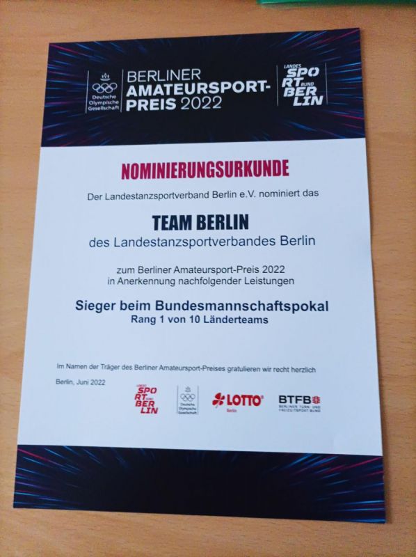 Am Freitag abend wurde in der VIP-Lounge der Max-Schmeling-Halle der diesjährige Berliner Amateur-Sportpreis verliehen. In Anwesenheit der Paare Fabian Lohauß/Simone Braunschweig, Peter und Sybille Schmiel sowie LTV-Vize-Präsident Götz Moser wurde das erfolgreiche LTV-Team des Bundesmannschaftspokal 2021 geehrt.