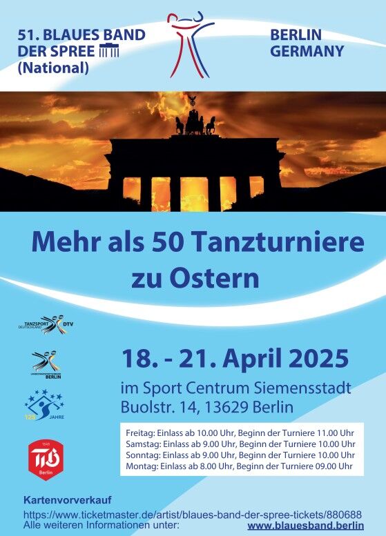 Am Karfreitag startet das „51. Blaue Band der Spree“ - ab 11 Uhr und dann bis Ostermontag werden über 500 Tanzpaarein den Standard- und lateinamerikanischen Tänzen an den Start gehen. Mehr als 50 Turniere stehen über die vier Tage im Sport Centrum Siemensstadt auf dem Programm. Wieder dabei sind auch Paare im Rahmen des kleinen Grenzverkehrs aus Österreich und Tschechien.