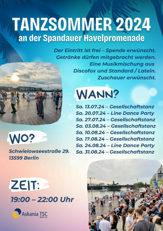 Ab heute und dann jeden Samstagabend bis Ende August ist der "Tanzsommer" da: der Askania TSC lädt an die Spandauer Havelpromenade zum Open-Air-Tanz beim Sonnenuntergang ein.