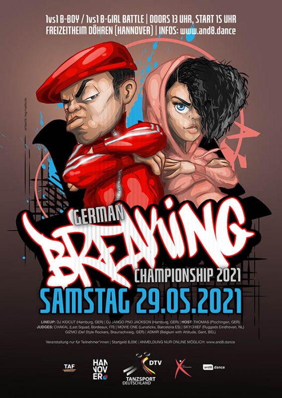 Der Deutsche Tanzsportverband veranstaltet in Kooperation mit der Stadt Hannover die "German Breaking Championship 2021". Am 29. Mai werden im Freizeitheim Döhren (Hannover) die besten Tänzer*innen gesucht, die Deutschland bei der Europameisterschaft in Sotschi (Russland) und bei der Weltmeisterschaft in Nanjing (China) vertreten.