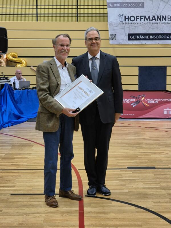 Mit der Verleihung einer seiner höchsten Ehrungen würdigt der Deutsche Tanzsportverband diese 30 Jahre ehrenamtliche Tätigkeit von Ronald Stiegert, der in Berlin auch als Vereinsvorsitzender des Ahorn-Clubs und als Wertungsgerichter stets engagiert war - ganz abgesehen von seiner eigenen sportlichen Karriere an der Seite seiner Frau Ellen Schrader-Stiegert, für den DTV und die damit verbundenen herausragenden Verdienste für den Tanzsport in Deutschland.