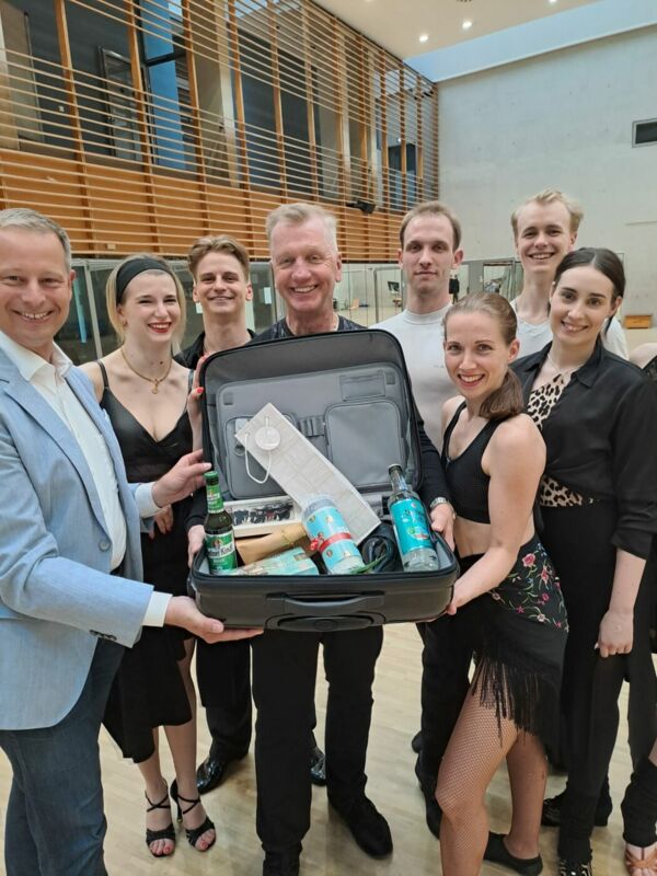 Die Paare des Masters- und Landeskader packten gemeinsam mit dem Präsidium einen Koffer aus Berlin gefüllt mit Erinnerungen, persönlichen Worten, Berliner Souvenirs und Köstlichkeiten. LTV-Präsident Thorsten Süfke und der Landeskader Latein überreichten diesen dann an Horst Beer zum Abschied (Foto).