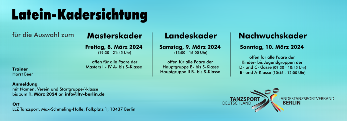 Am zweiten März-Wochenende laden Landes- und Bundestrainer Latein, Horst Beer, und der Landes- bzw. Jugendsportwart zu den diesjährigen Sichtungen in den lateinamerikanischen Tänzen für die insgesamt drei Kadergruppen des Landestanzsportverband Berlin und der Berliner Tanzsport-Jugend ein.