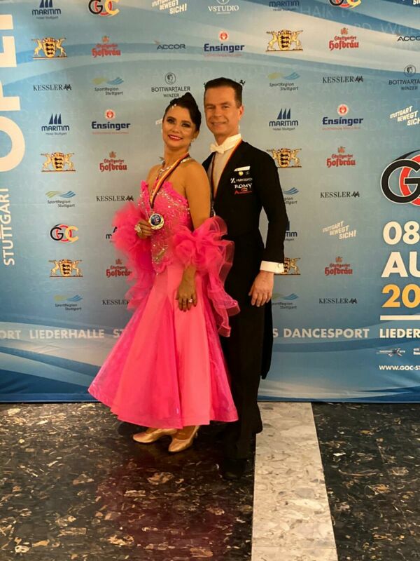 Mit einer einzigen Ausnahme glich das GOC-Finale der Senioren III Standard dem der Weltmeisterschaft dieser Altersgruppe aus 2022. Das Wertungsgericht im Beethovensaal bestätigte ebenso die Reihenfolge: Die amtierenden Weltmeister Gert Faustmann/Alexandra Kley (Blau-Silber TSC) sicherten sich mit allen gewonnenen Tänzen GOC-Gold – und dies zum zweiten Mal. Ein ebenso klares Ergebnis fuhren die Vizeweltmeister ein, die auch in Stuttgart in allen Tänzen Platz zwei belegten.