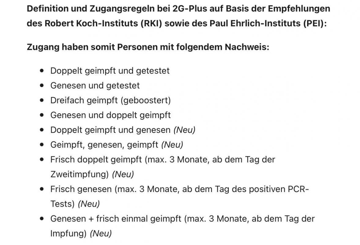 Die Definition und Zugangsregeln bei 2G-Plus auf Basis der Empfehlungen des Robert-Koch-Instituts (RKI) zeigt diese Abbildung (Quelle: hessen.de). Unten stehendes pdf-Dokument zeigt dies etwas ausführlicher auf.