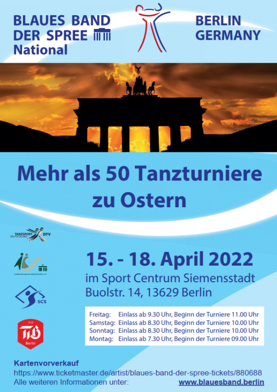 Pünktlich zum Osterfest ging Berlins größtes Tanzturnier in seine 48. Auflage! Erstmals seit 2019 wurden zwischen Karfreitag und Ostermontag wieder über 50 Turniere ausgetragen. Nach zwei Jahren coronabedingter Abstinenz feiert das Blaue Band der Spree im Sport Centrum Siemensstadt sein Comeback. Rund 500 Tanzpaare traten in zahlreichen Alters- und Leistungsklassen in den Standard- und Lateintänzen an.