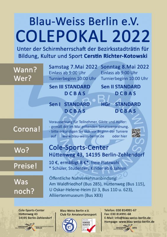 Der Ausrichter Blau-Weiss Berlin empfiehlt, während der gesamten Veranstaltung außerhalb der Tanzfläche mindestens eine medizinische Maske zu tragen. Personen mit Erkältungssymptomen mögen der Veranstaltung bitte fernbleiben.