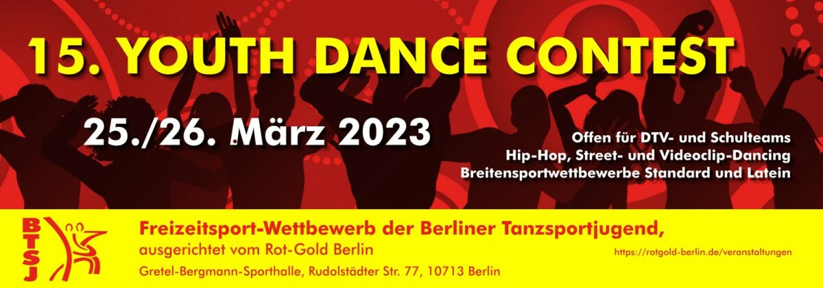 Der 15. Youth Dance Contest nähert sich mit großen Schritten! Also am besten gleich jetzt anmelden zur Veranstaltung am 25. und 26. März in der Gretel-Bergmann-Sporthalle. Und zwar unter https://rotgold-berlin.de/veranstaltungen...dort könnt ihr euch noch bis zum 15. März anmelden und findet ihr auch die Teilnahmebedingungen und Regeln.