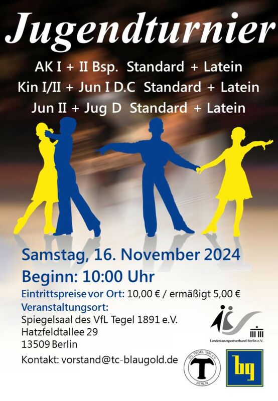 Am 16. und 17. November 2024 findet im TC Blau Gold im VfL Tegel 1891 das Jugendturnierwochenende statt – mit einer Premiere für den Berliner Tanzsport: Zum ersten Mal können Paare der D- und C-Klassen in Kombinationsturnieren antreten. Dieses Format wird im Rahmen des DTV-Pilotprojekts „Basic Kombination Turniere“ für die Jugend-Gruppen angeboten.