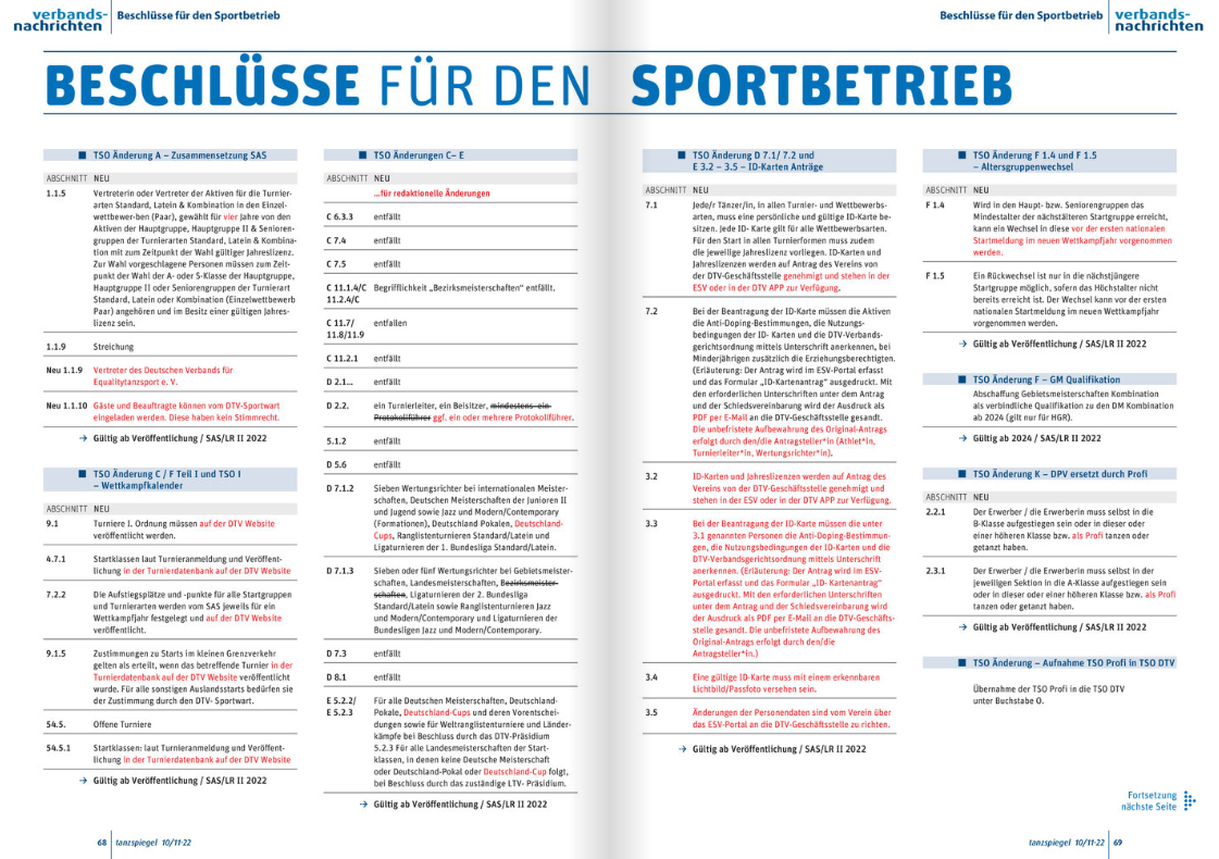 Die bisherige Veröffentlichungspflicht im gedruckten Tanzspiegel entfällt nach Beschluss aller DTV-Gremien mit sofortiger Wirkung. Ab sofort ist für den Turnierbetrieb ausschließlich die Turnierdatenbank unter tanzsport.de maßgeblich. Und Regeländerungen gelten zukünftig mit dem Zeitpunkt der Veröffentlichung (oder einem benannten späteren Termin) auf der DTV-Homepage (www.tanzsport.de).