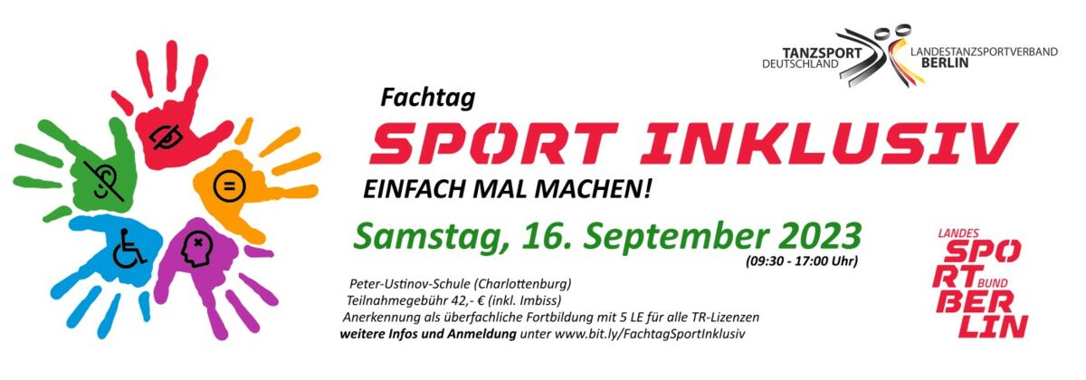 Erstmals beteiligt sich der Landestanzsportverband Berlin sich am Fachtag "Sport inklusiv" des Landessportbund Berlin. Dort können auch alle Lizenzträger*innen des Tanzsports bis zu fünf Lerneinheiten im überfachlichen Bereich für den Lizenzerhalt anerkannt bekommen. Insgesamt werden am 16. September (9:30 bis 17:00 Uhr) mehr Lerneinheiten angeboten und man kann auch bei anderen Sportarten Impulse für Inklusion kennen lernen – mehr Infos. Der Anmeldeschluss wurde bis zum 10. September (Sonntag) verlängert.