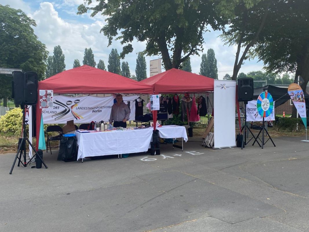 Beim Aufbau am Freitag abend wussten wir noch nicht, ob am anderen Morgen unsere Pavillions noch stehen, aber der Wettergott hatte ein Einsehen. Und so können die Besucher seit Samstag vormittag den Tanzsport kennenlernen, ausprobieren und bei Quiz sowie Glücksrad mehr erfahren sowie gewinnen.