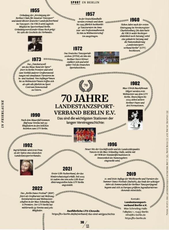 Das Printmagazin des Landessportbund Berlin "Sport in Berlin" gratuliert in seiner aktuellen Ausgabe (1/2025) zum 70jährigen Bestehen des Landestanzsportverband Berlin. Für die Rubrik "In Feierlaune" (Seite 38 ) hat LTV-Archivar Dirk Ullmann einige Stationen unserer Verbandsgeschichte zusammengestellt. Bekannte und weniger bekannte Meilensteine führen von den Anfängen im Jahr 1955 bis in die Gegenwart.