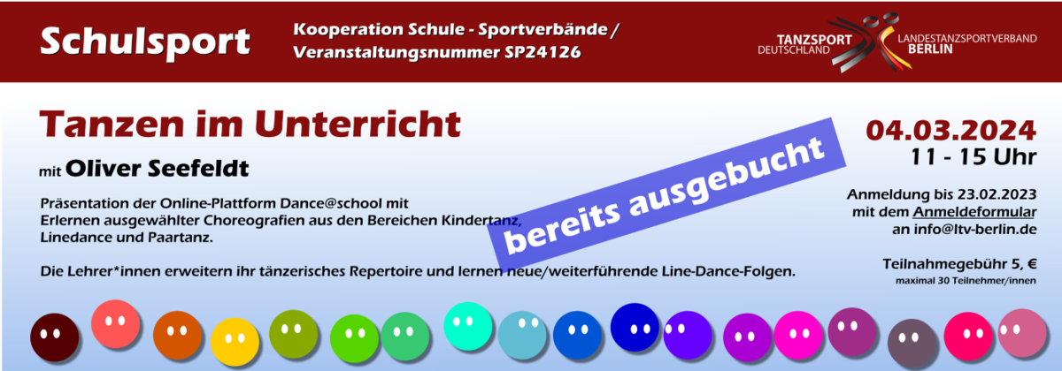 Im Rahmen der Kooperation Schule - Sportverbände folgt, fast schon traditionell, im März die erste Lehrerfortbildung des Jahres. Unter Veranstaltungsnummer SP24126 und dem Titel "Tanzen im Unterricht" präsentiert diesmal Referent Oliver Seefeldt die gemeinsame Online-Plattform "dance@school", deren Inhalte sowie die praktische Umsetzung zum Erlernen ausgewählter Choreografien aus den Bereichen Kindertanz, Linedance und Paartanz.