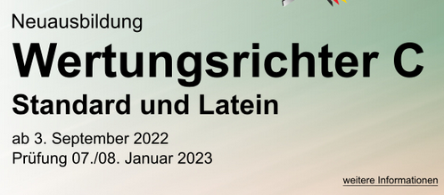 Wir suchen weiterhin noch motivierte und engagierte Teilnehmer*innen für den in Kürze beginnenden Erwerbslehrgang Wertungsrichter C Standard und Latein, die unter Berücksichtigung der Wertungsgebiete Musik, Balancen, Bewegungsablauf und Charakteristik zukünftig gerechte Wertungen abgeben und somit unseren schönen (Turnier-)Sport in diesen Turnierarten unterstützen.