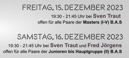 Am dritten Adventswochenende wird es zwei offene Trainings mit Fred Jörgens und Sven Traut für alle Berliner B/A/S-Paare geben: